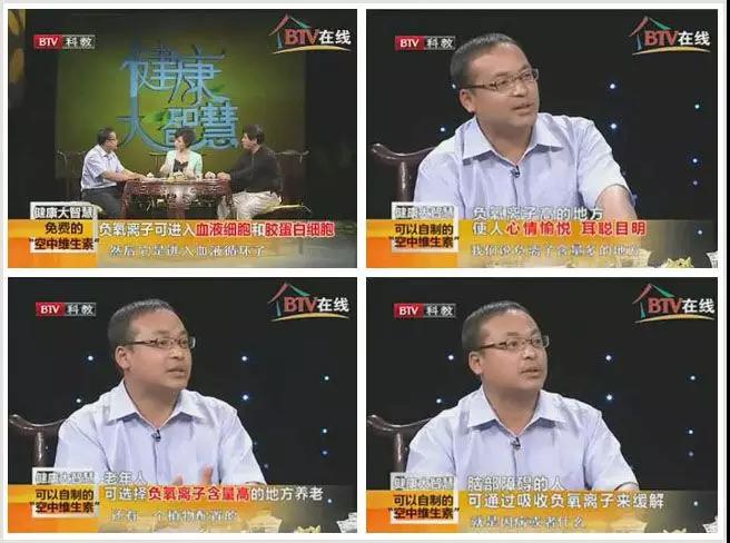 除此之外,负离子也登上了各大知名访谈栏目,比如中央电视台《健康大智慧》栏目就请到了北京林业大学园林学院副教授王忠君作为嘉宾介绍负离子的功效。王忠君教授带领队伍从1985年起率先在国内开始进行城市空气负离子相关研究。在节目中,王教授详细讲解了关于负离子对于人体的功效:负氧离子就是人体中需要补充的“空中维生素”。王教授还说到,负氧离子可缓解精神压力 有益心肺功能;负氧离子可刺激鼻腔黏膜 使人清醒;负氧离子可缓解焦虑 紧张急躁等城市病;缺乏负氧离子,甚至会造成空气污染致人死亡。