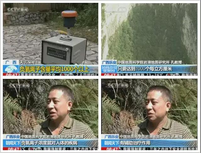 在CCTV新闻频道《朝闻天下》天坑探秘中,中国地质科学院岩溶地质研究所孔教授也提到了,只要达到1000个每立方厘米,负氧离子浓度就对人体的疾病有辅助治疗作用。